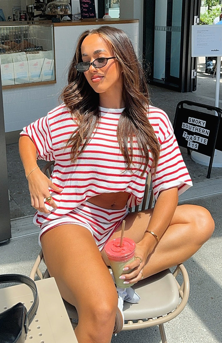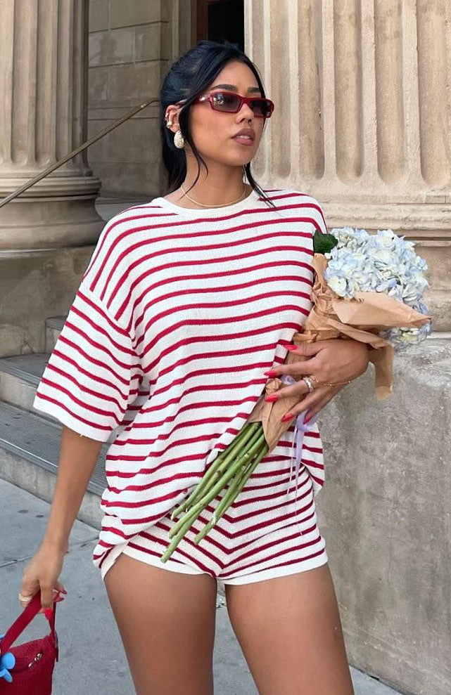 The All The Little Things Top Red Stripe is a must for your new season lounge collection. Features an over-sized look. no lining. slightly sheer. stretch material for an easy slip on design and full length. Style with All The Little Things Shorts and your favourite pair of sneakers for a cozy vibe!Â