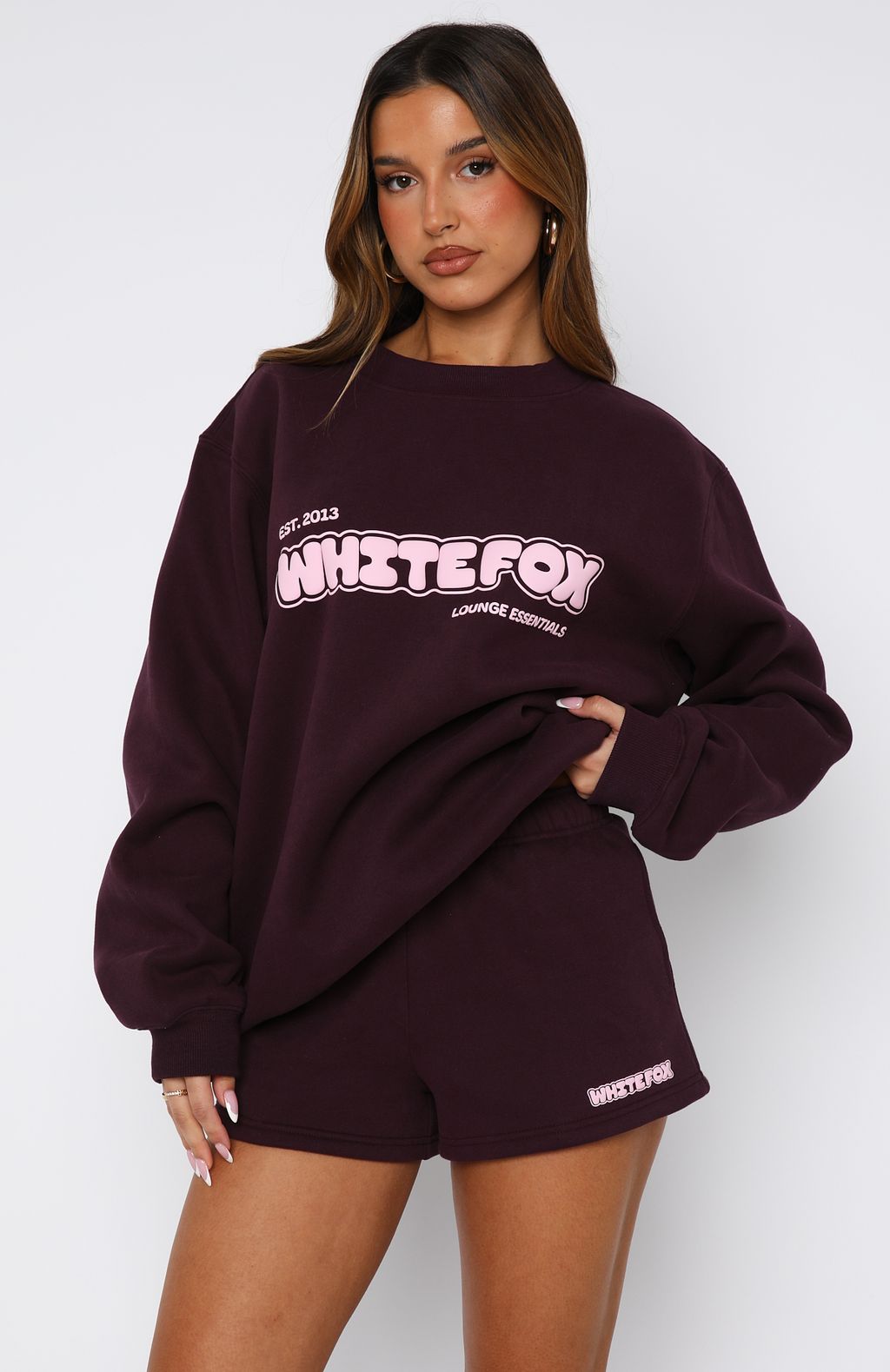 Slip into comfort with the Give It A Try Lounge Shorts in Plum! Features thick elasticated waistband with internal drawstring. side pockets and signature puff print White fox text side front. For a matching moment pair with the Give It A Try Oversized Sweater in Plum.