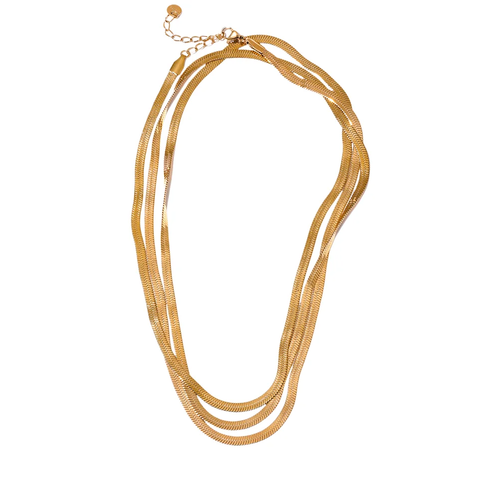 This necklace features a long. flat chain that mimics the sinuous movement of a snake. creating a tactile and visual appeal. The design is minimalist yet striking. with a smooth. reflective surface that glimmers in the light.