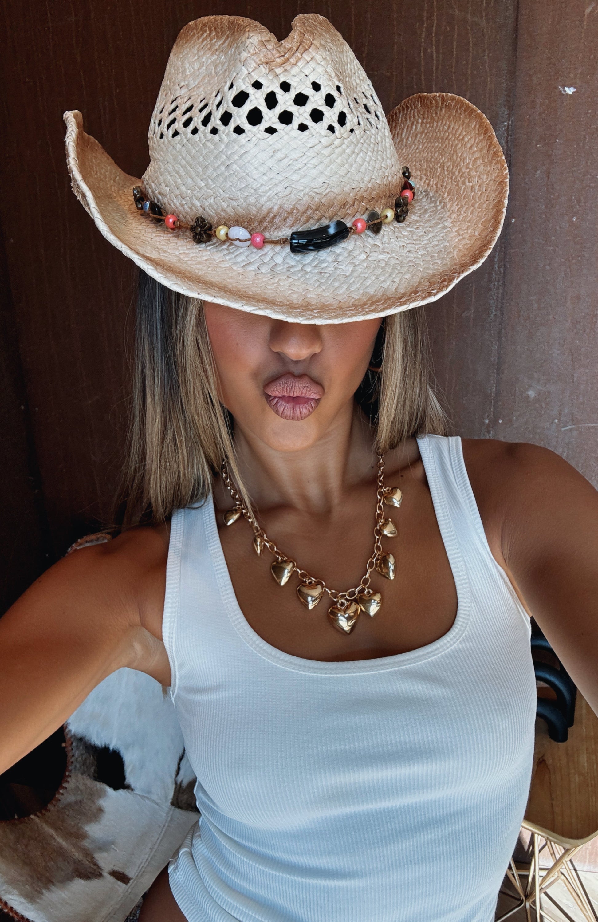Saddle up for a wild night in the Montana Cowboy Hat Toasted Oats! Features a wide brim design and beaded detailing. The perfect finishing touch for your next festival fit' or dress-up party! Â