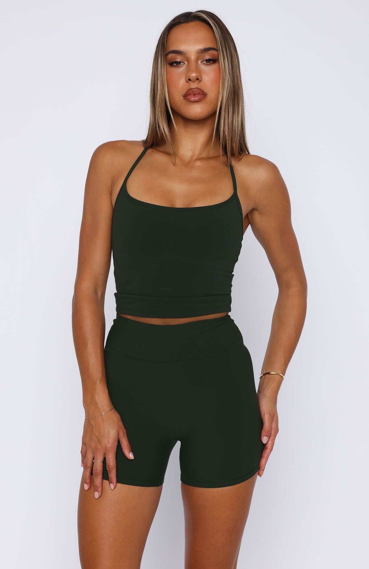Ready for your next work-out in style? The Never Last Crop Forest features a halter style. thin. adjustable strap. a low scooped neckline. lined fabric. removable padding with inbuilt crop and printed logo centre back. Complete the set with the matching Keep Up High Waisted Shorts in Forest for a look we love!