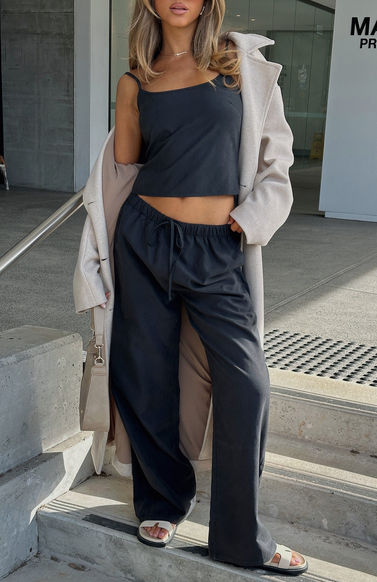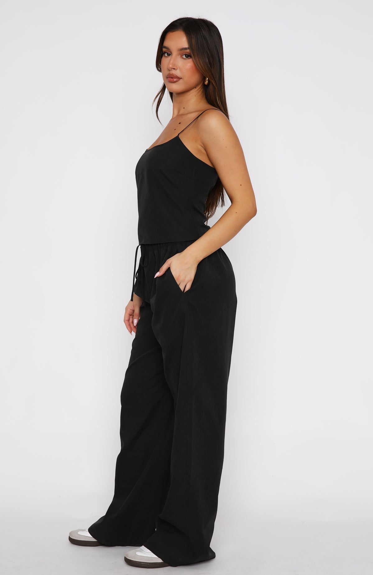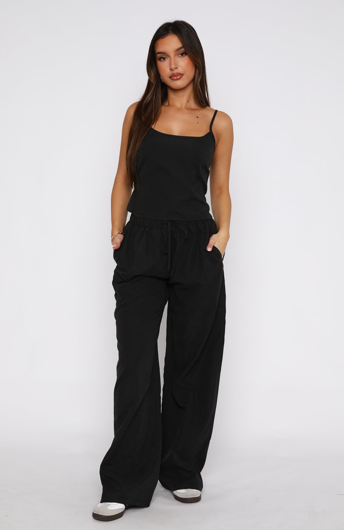 The Power To Her Set Black is a weekend staple! This set features a simple top with thin adjustable straps. scoop neckline and lightweight fit. The pants are a mid rise design. featuring a drawstring waistband. straight leg design and easy fitting design. We love this paired with cute shades and platform slides for the perfect weekend fit!