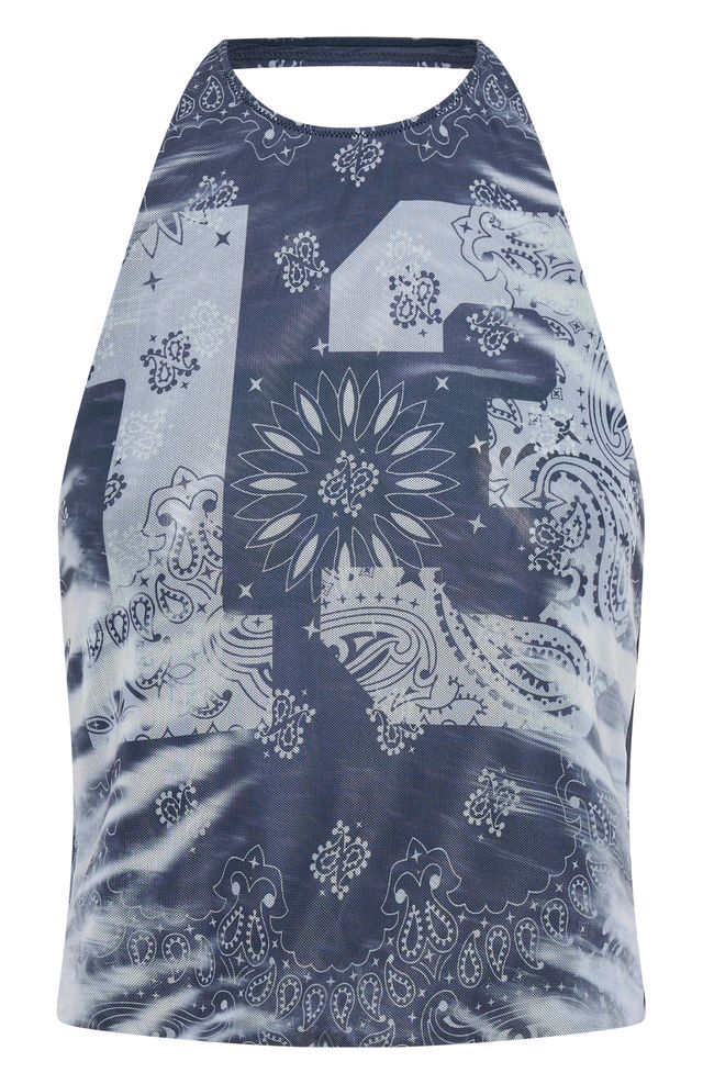 New obsession unlocked with the Rooftop Dreamer Top Thirteenth Dimension. Featuring a halter neck design. thick tie-up straps. sheer mesh lined fabric. backless and with a detailed blue print. Best paired with the matching Eclipse Heart Mini Skirt Thirteenth Dimension!