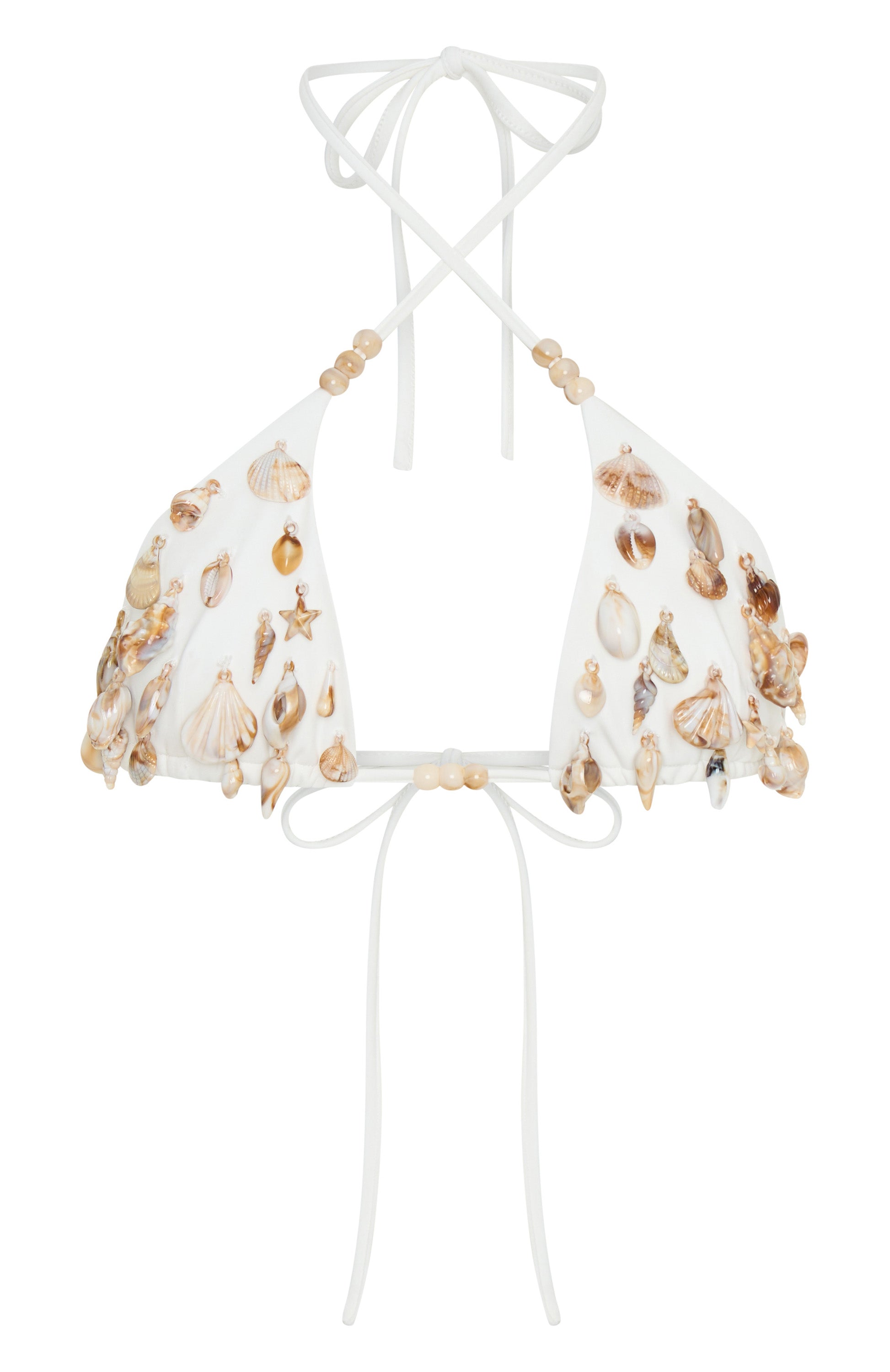 Channelling effortless beach chic. the Share It With You Top in White is your new go-to for making an entrance. Features self tie halter neck and back straps and shell detailing over fabrication.Â