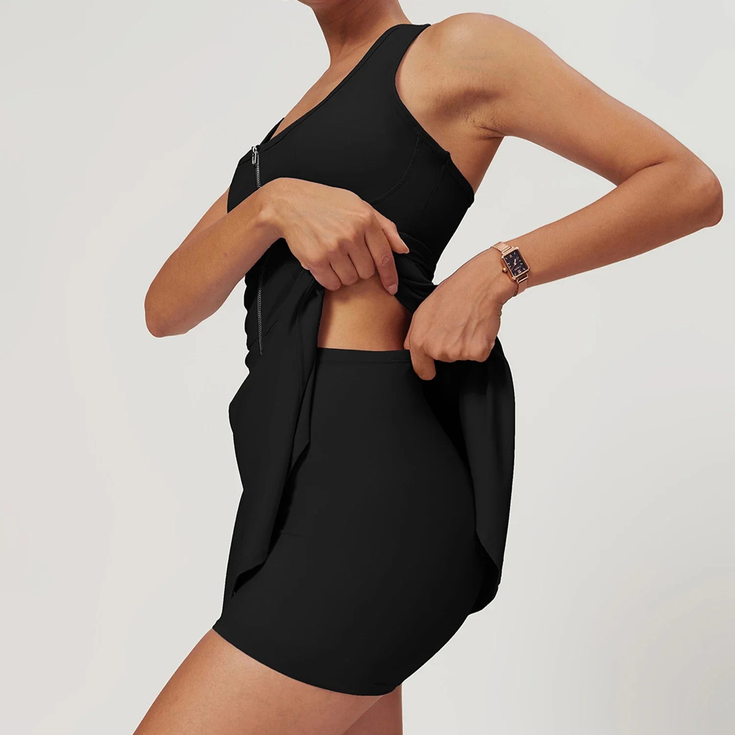- Length: Mini length. hits mid-thigh for ease of movement