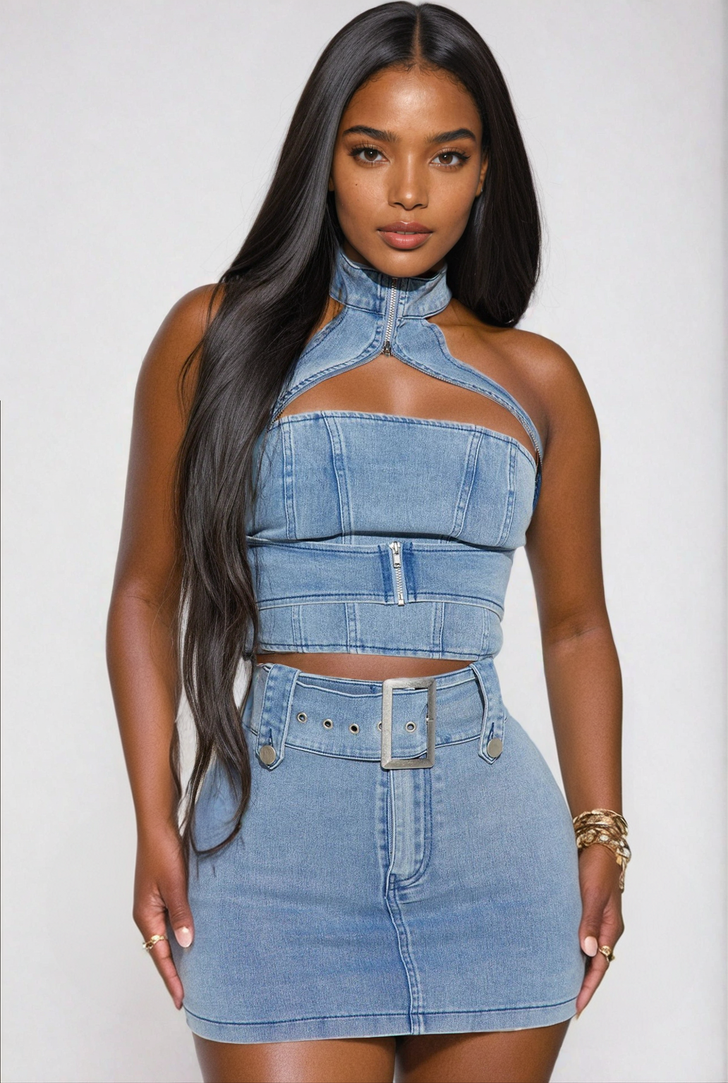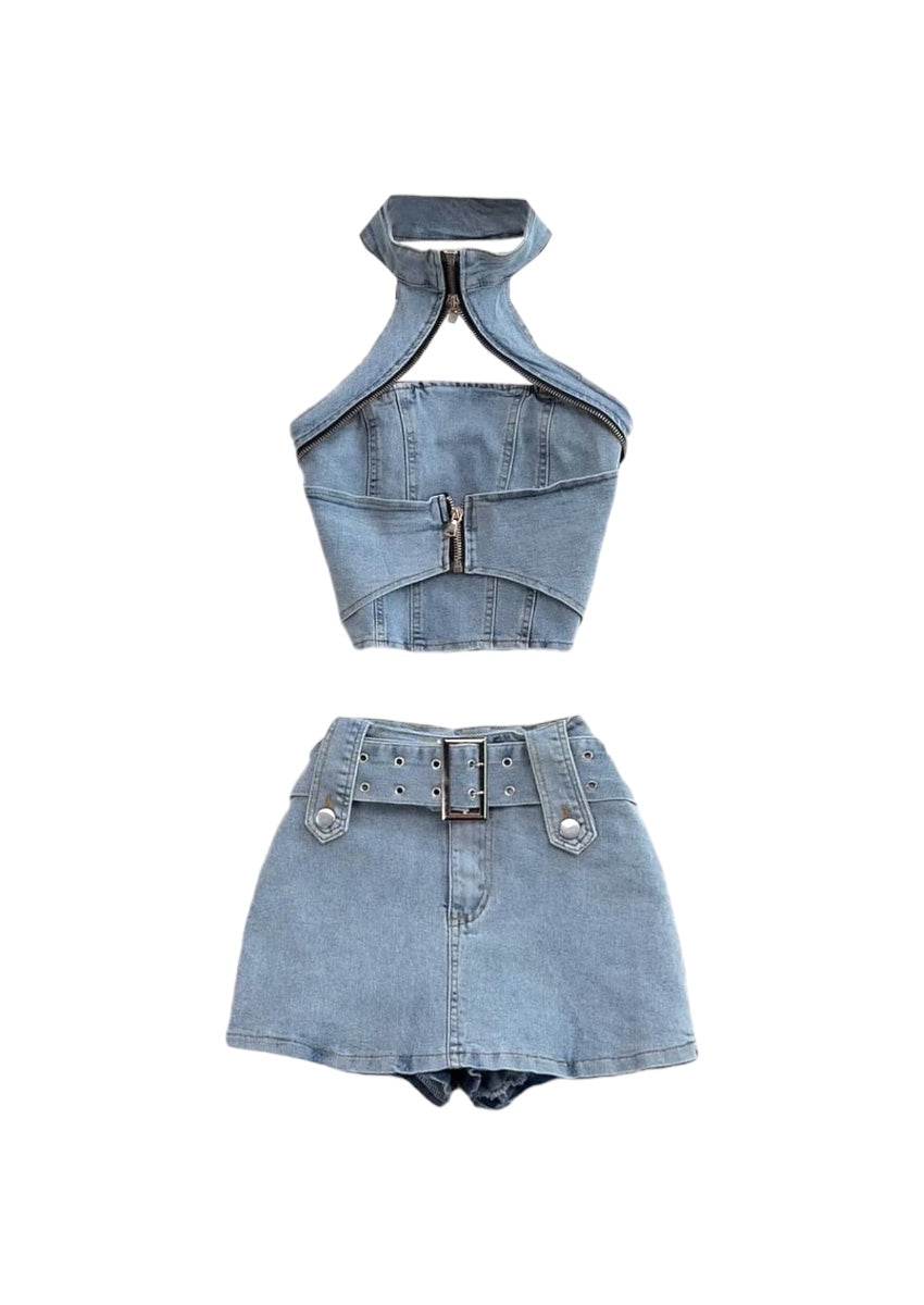 Streetwear Denim Halter Top Mini Skirt 2 Piece Set