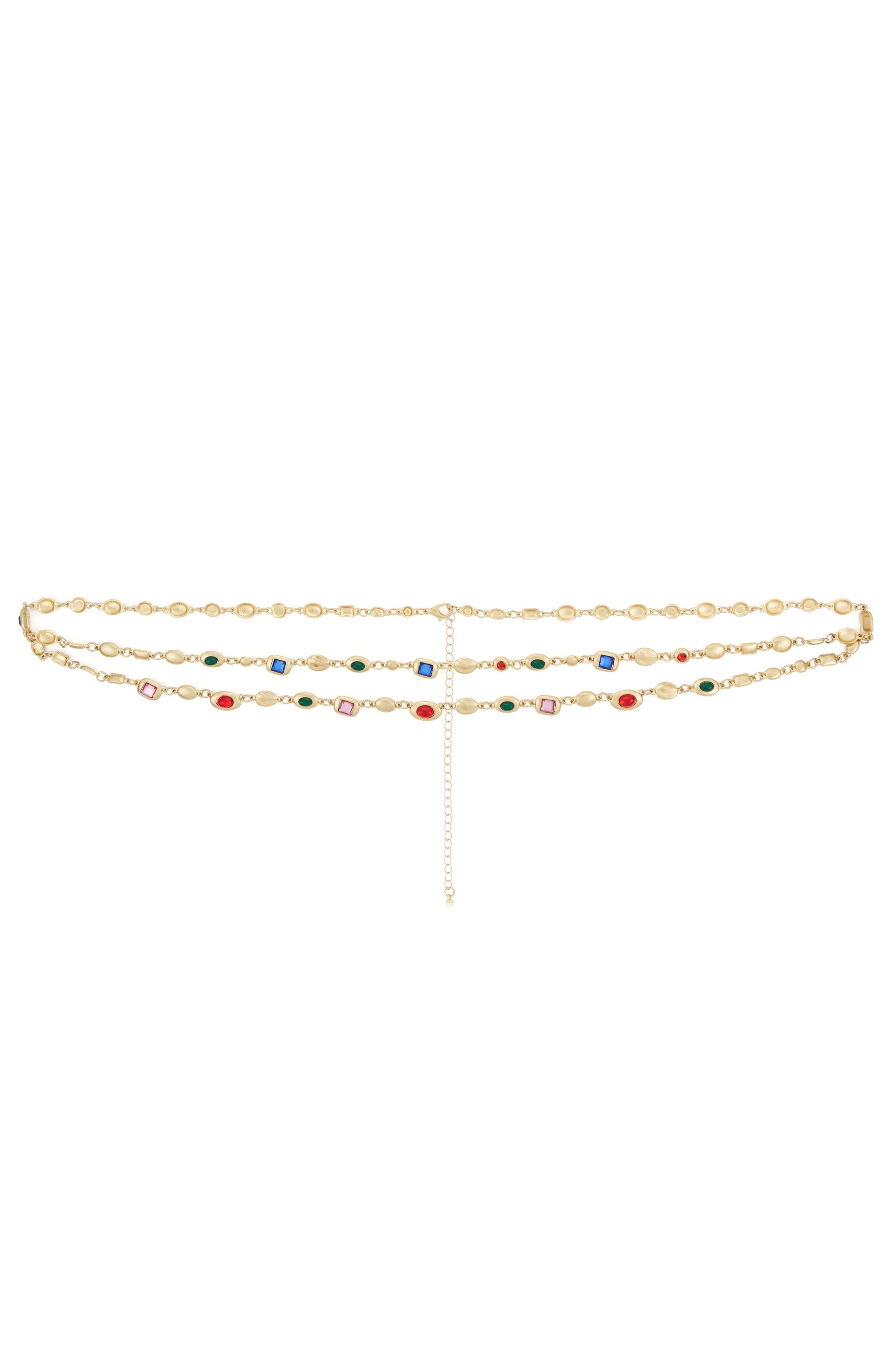 Add some colour to your festival outfit with the Valda Body Chain Gold! Featuring a layered design. gold plated hardware with a coloured beaded design and an adjustable clasp closure.Â