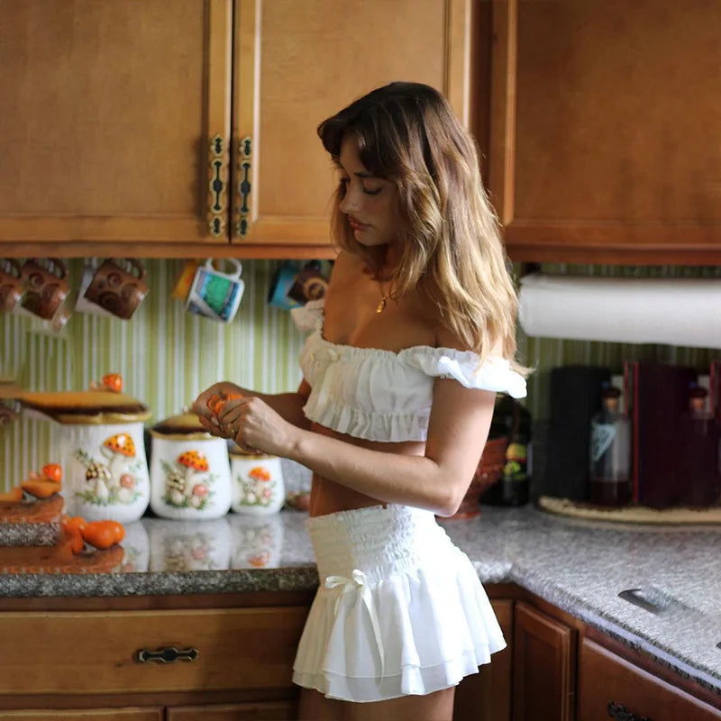 White Ruched Bandeau Top and Pleated Mini Skirt Set